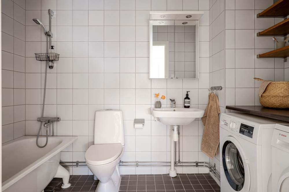 • BADRUMHelkaklat badrum inrett med wc, tvättställ med kommod, dusch med vikbara glasdörrar, tvättmaskin,