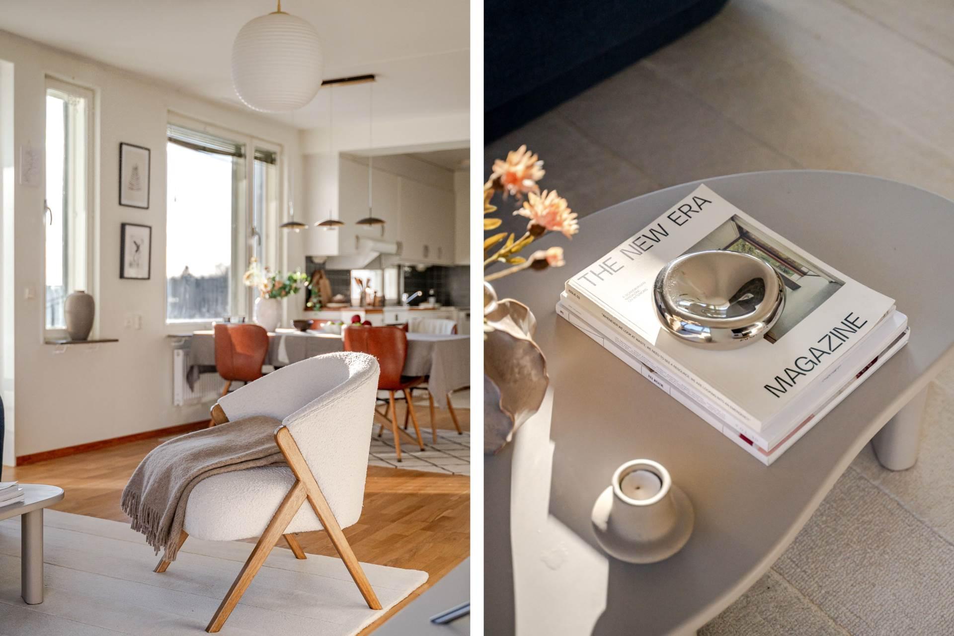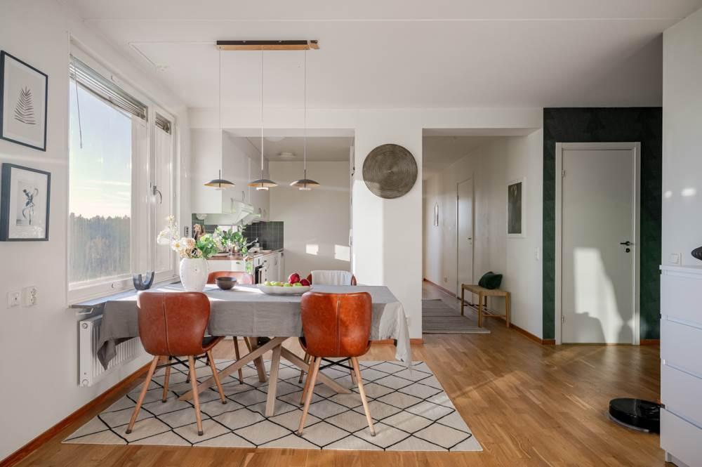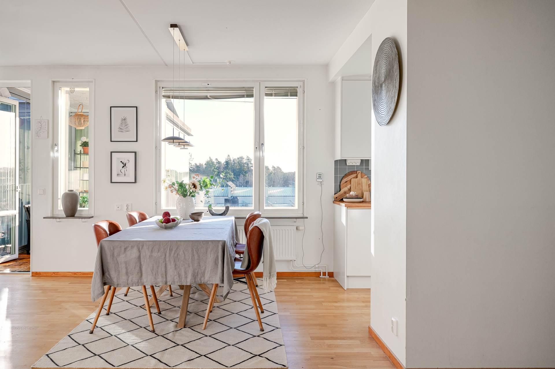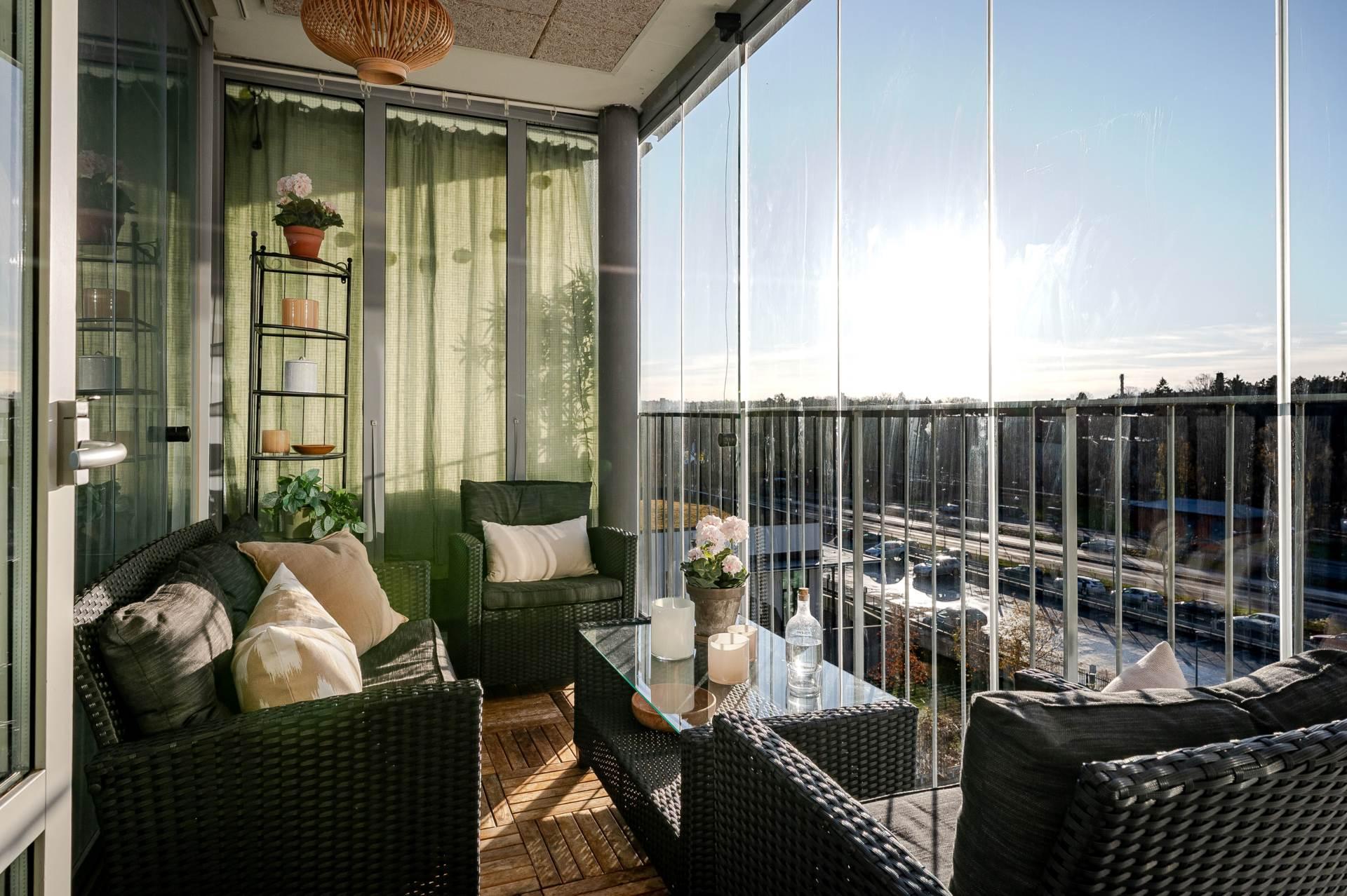 Den inglasade balkongen blir snabbt en favoritplats. I sitt soliga läge erbjuder den en perfekt oas för morgonkaffet, en bokstund eller sköna kvällar med utsikt över omgivningarna. Tack vare läget högst upp i huset får du dessutom extra ro och avskildhet.