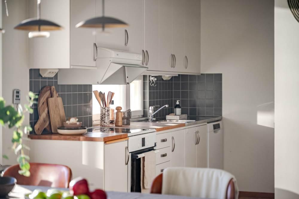 • KÖK Stilrent kök med ljusa skåpluckor med kakel ovanför arbetsbänk. Köket är maskinellt utrustat med