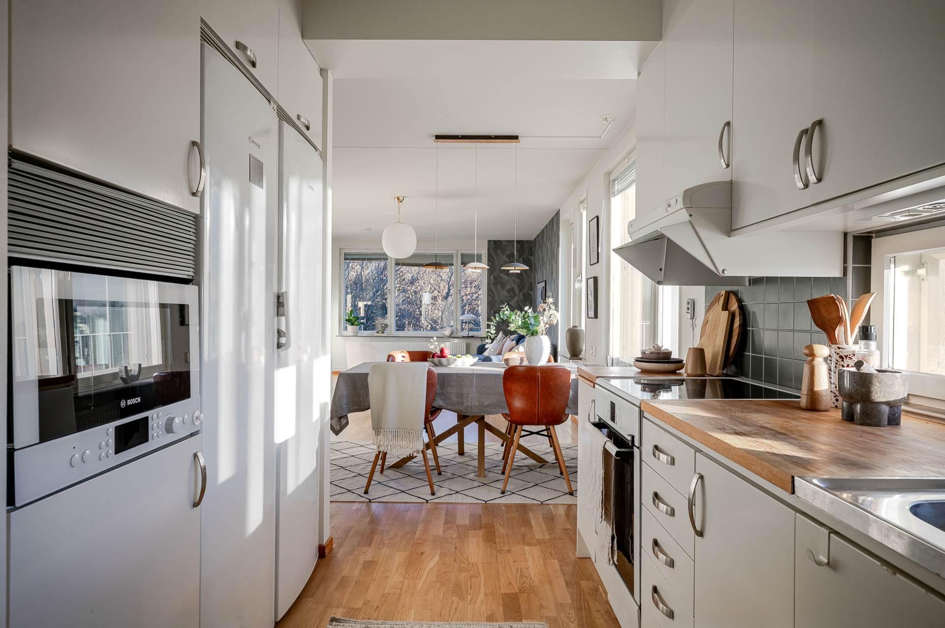 spishäll, äkt, ugn, integrerad diskmaskin samt kyl/frys. Halvöppen planlösning mot vardagsrum.