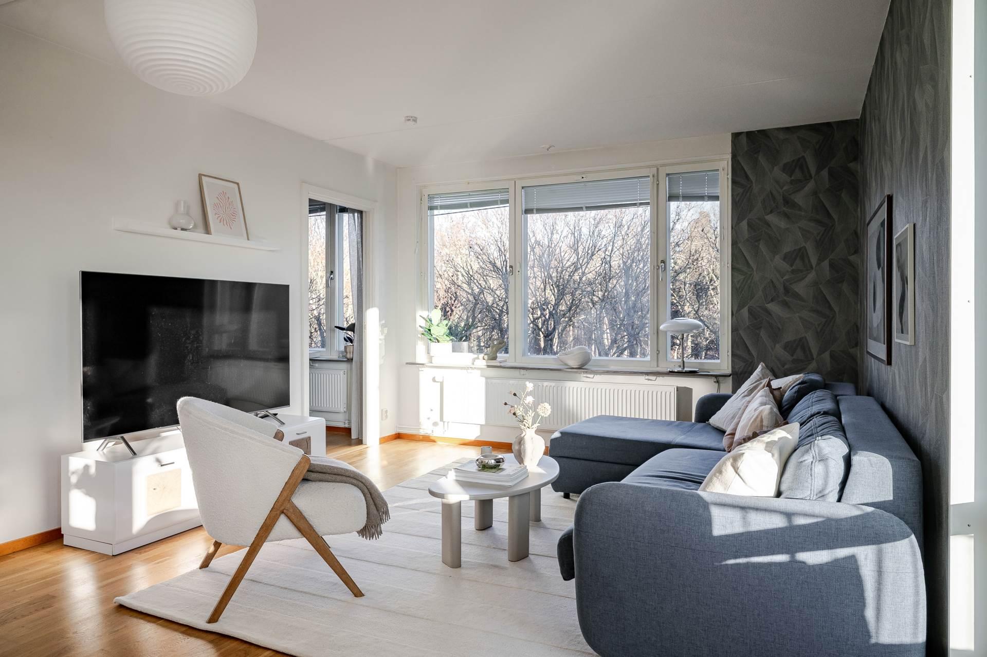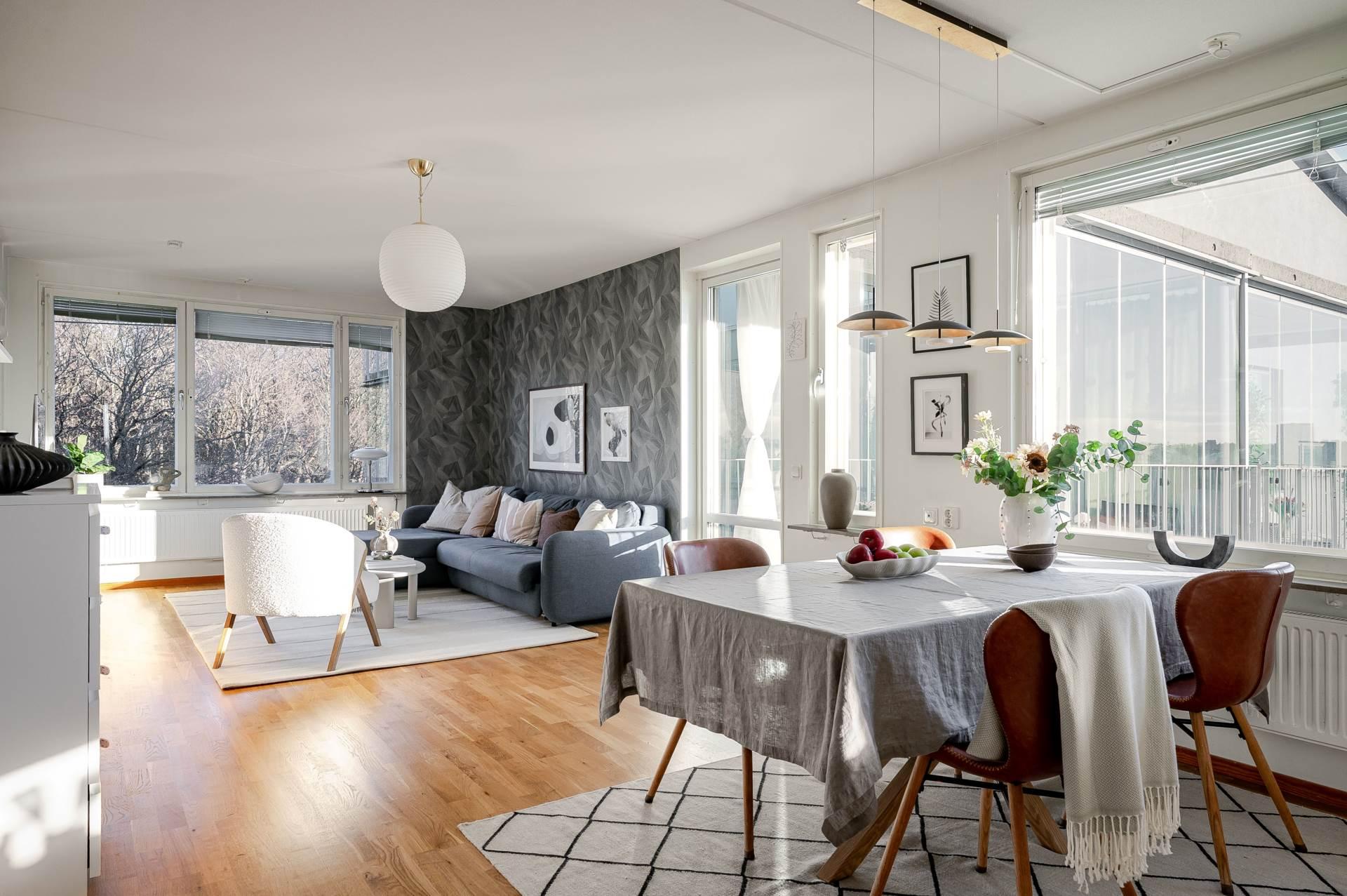 • VARDAGSRUMRymligt vardagsrum med fönster i flera väderstreck. Plats för större soffgrupp och matplats för 6-8 personer. Från vardagsrummet nås även bostadens inglasade balkong som förlänger sällskapsytan ytterligare