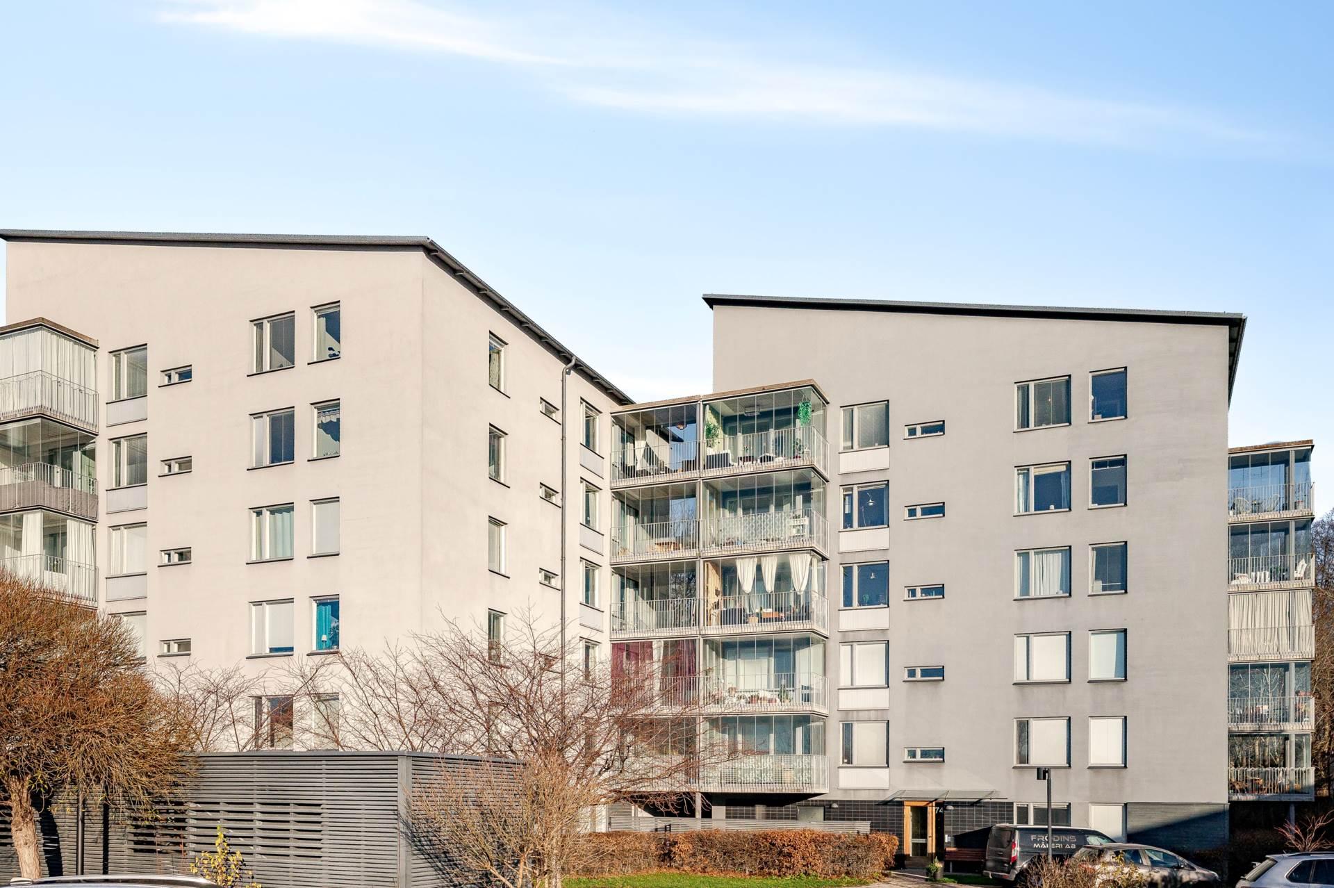 Ljus gavelfyra högst upp med inglasad balkong, två badrum och där föreningen äger marken