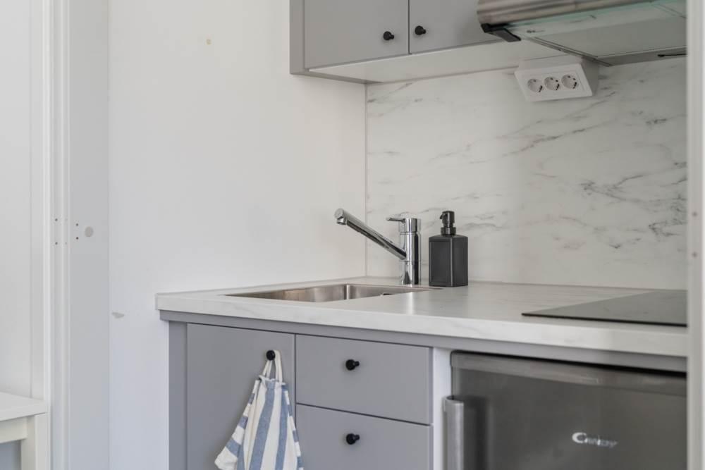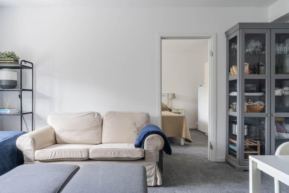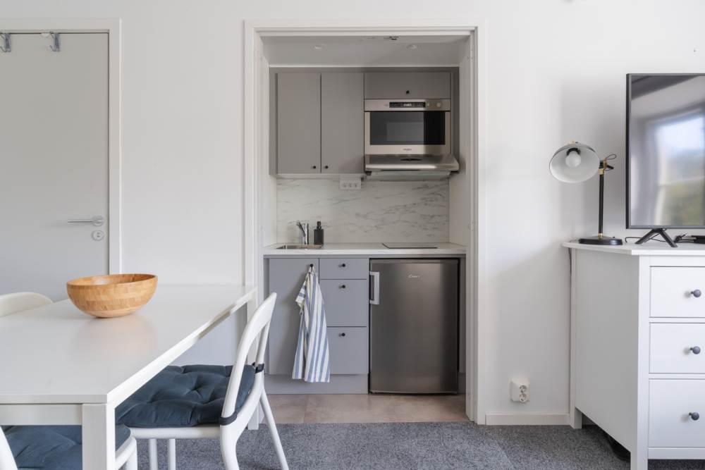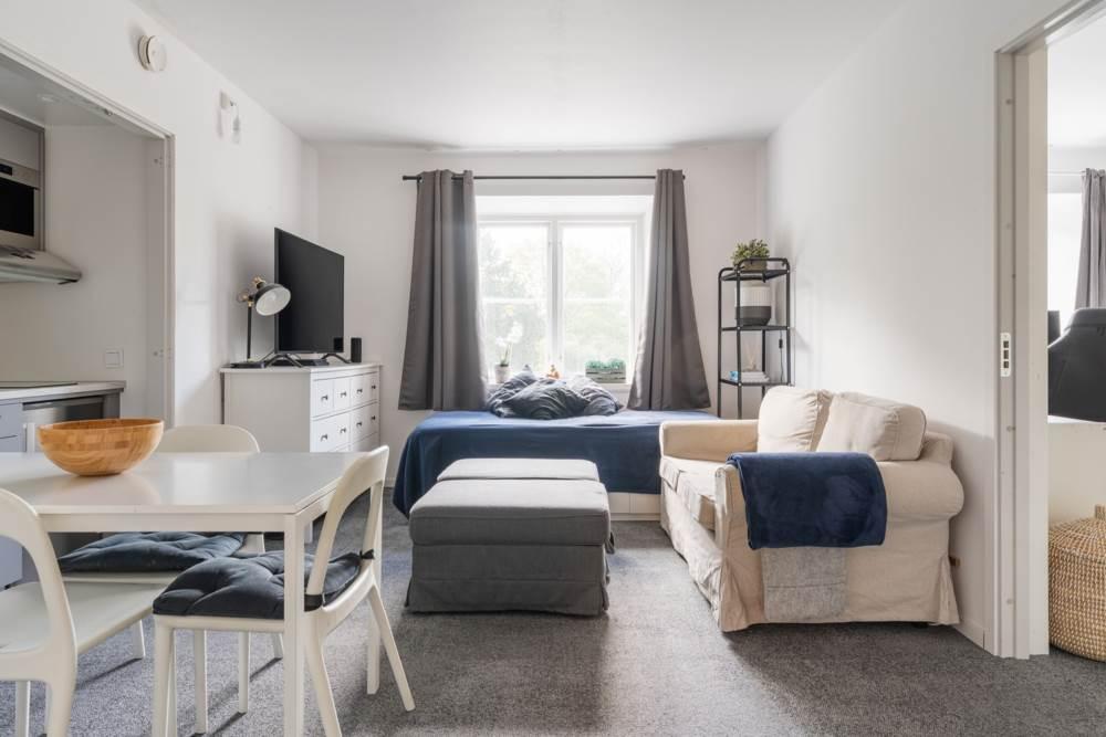 Vardagsrummet är ljust och luftigt – en trivsam plats att koppla av på, med en smart planerad kokvrå i direkt anslutning som gör matlagningen både praktisk och social.