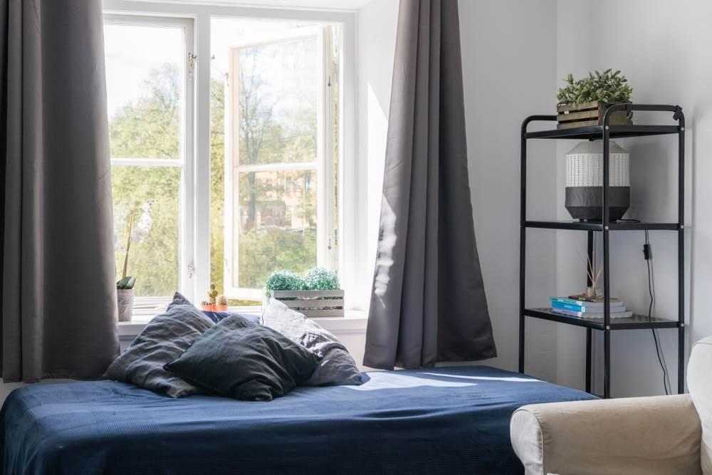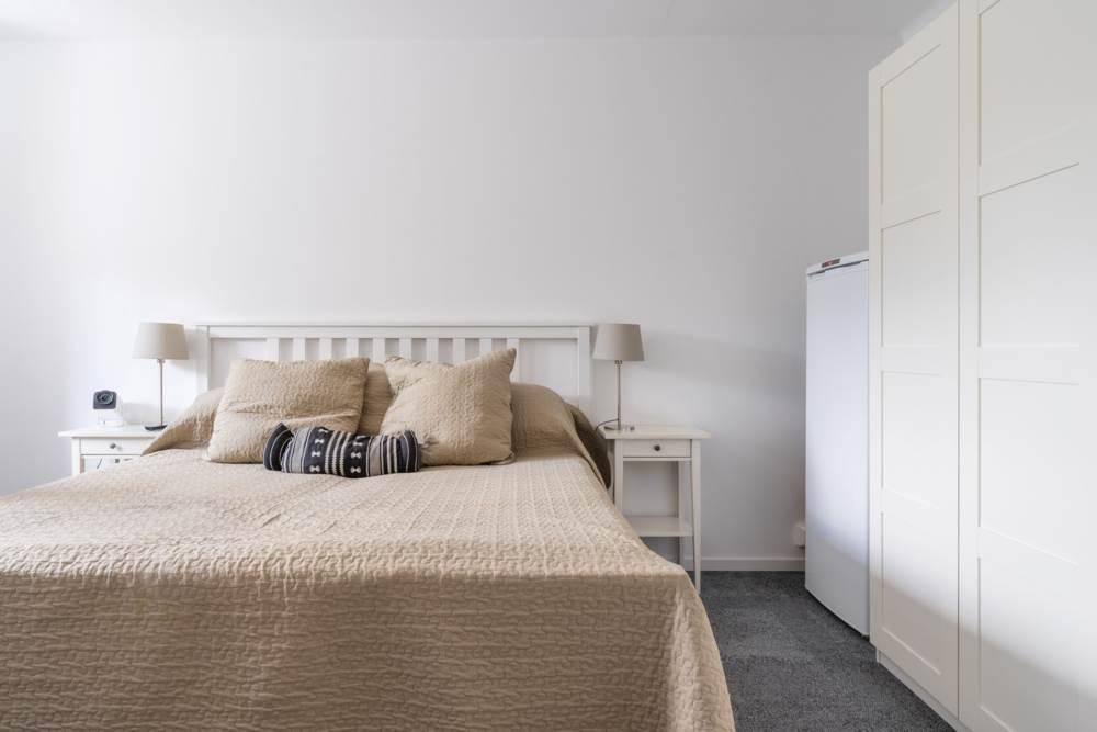 Sovrummet är rymligt och rogivande, utrustat med en stor garderob bakom stilrena dörrar som erbjuder gott om förvaring utan att tumma på estetiken. Väggarna är målade i lugna, moderna toner som skapar en enhetlig och inbjudande känsla genom hela hemmet.