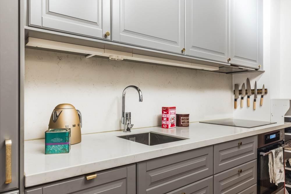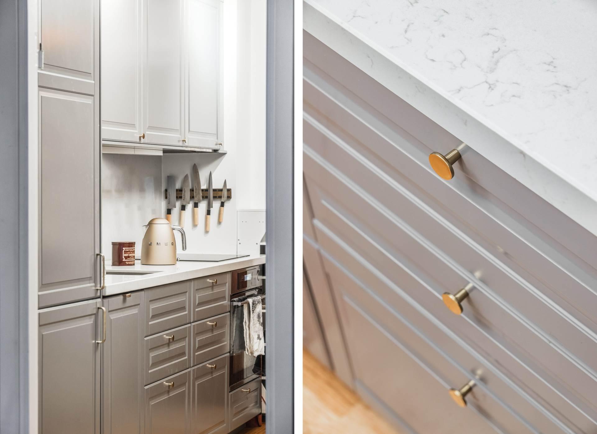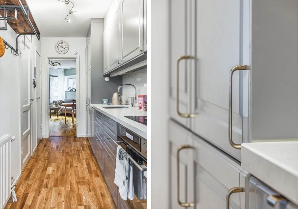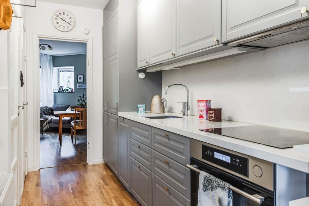 • KökRenoverat kök med ljust parkettgolv och målade väggar. Moderna färger med gråa köksluckor och bänkskiva i marmormönstrad kompositsten ovan. Spis, ugn, fläkt, kyl/frys och diskmaskin.