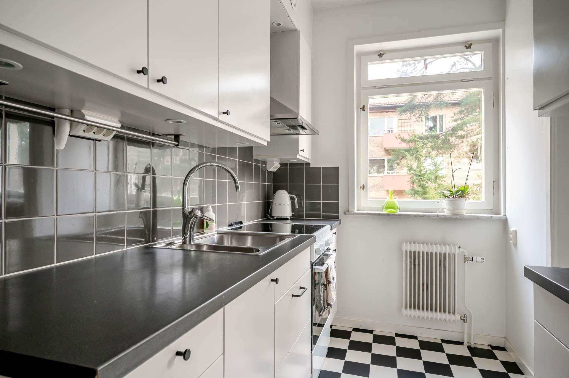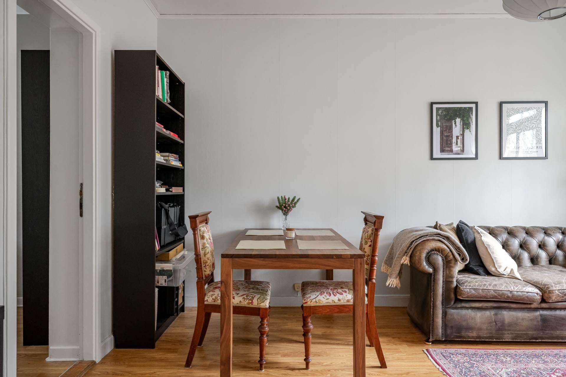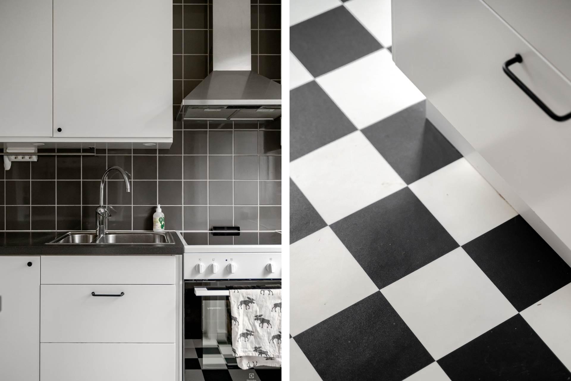 Hallen möter dig med generös förvaring och ett välkomnande intryck. Vidare leds du in i bostaden där ett vackert trägolv löper genom samtliga rum, förutom i köket där ett charmigt schackrutigt golv sätter tonen. Det trivsamma köket erbjuder gott om förvaring och bra arbetsytor – en perfekt plats för både vardagsmatlagning och socialt umgänge.