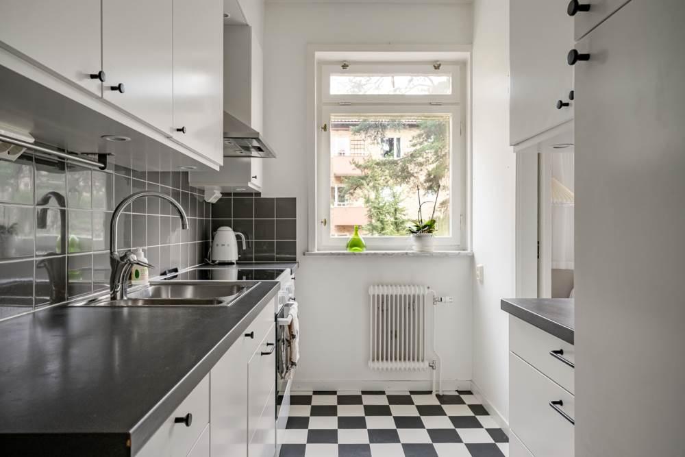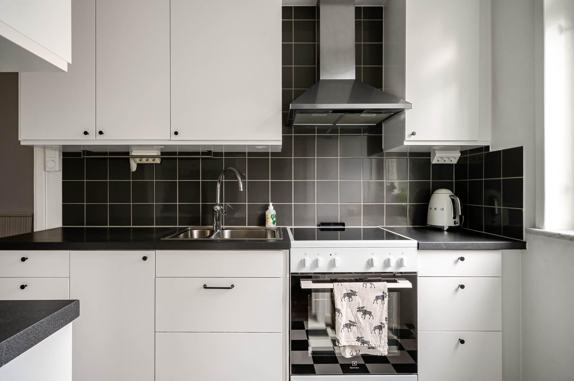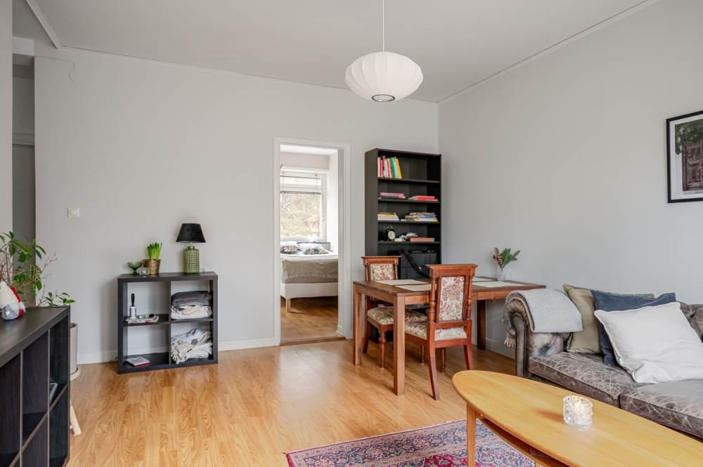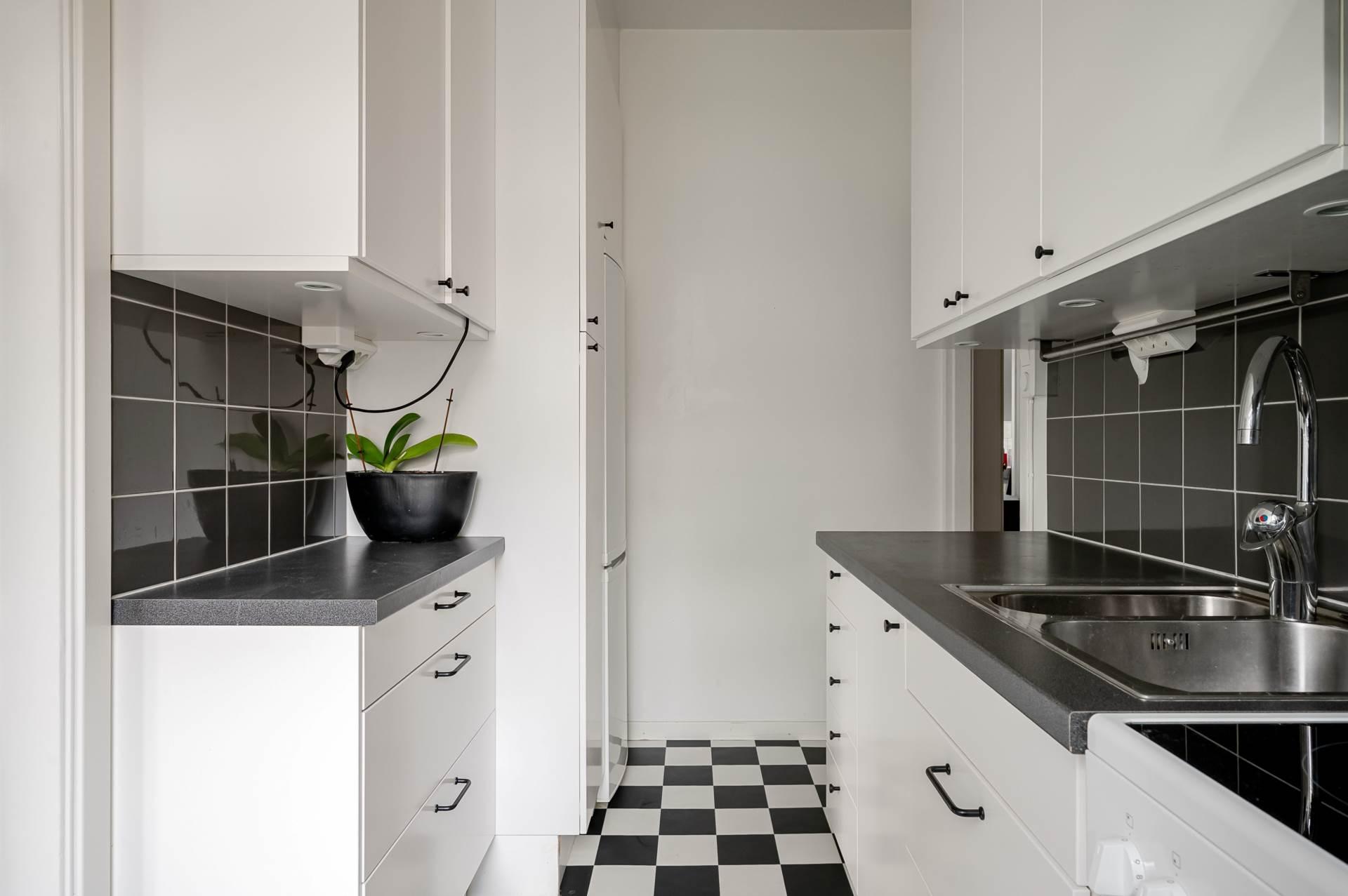 Hallen möter dig med generös förvaring och ett välkomnande intryck. Vidare leds du in i bostaden där ett vackert trägolv löper genom samtliga rum, förutom i köket där ett charmigt schackrutigt golv sätter tonen. Det trivsamma köket erbjuder gott om förvaring och bra arbetsytor – en perfekt plats för både vardagsmatlagning och socialt umgänge.