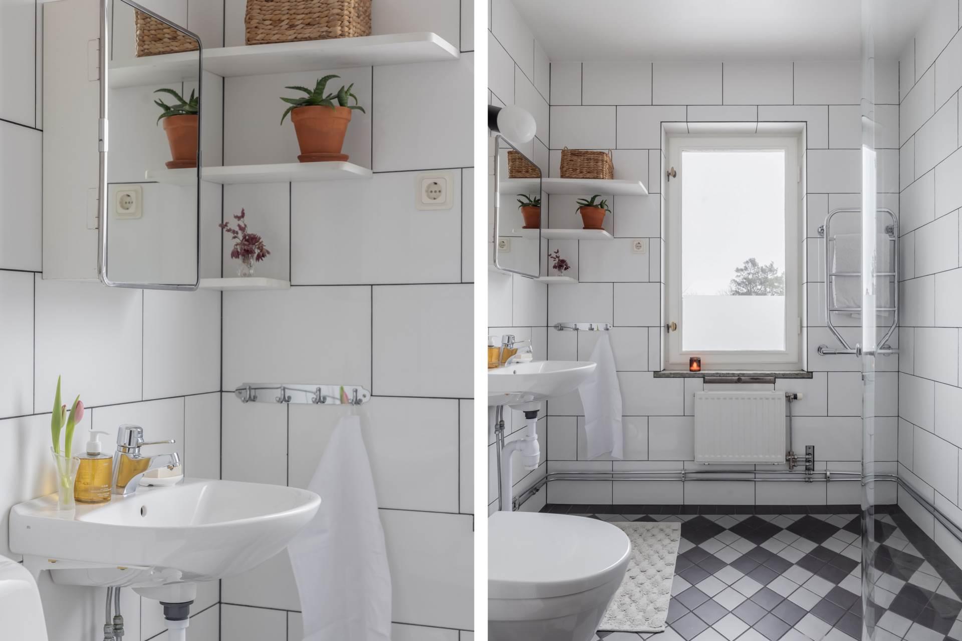Det helkaklade badrummet är fräscht och funktionellt, förberett för tvättmaskin – en praktisk detalj som förenklar vardagen.