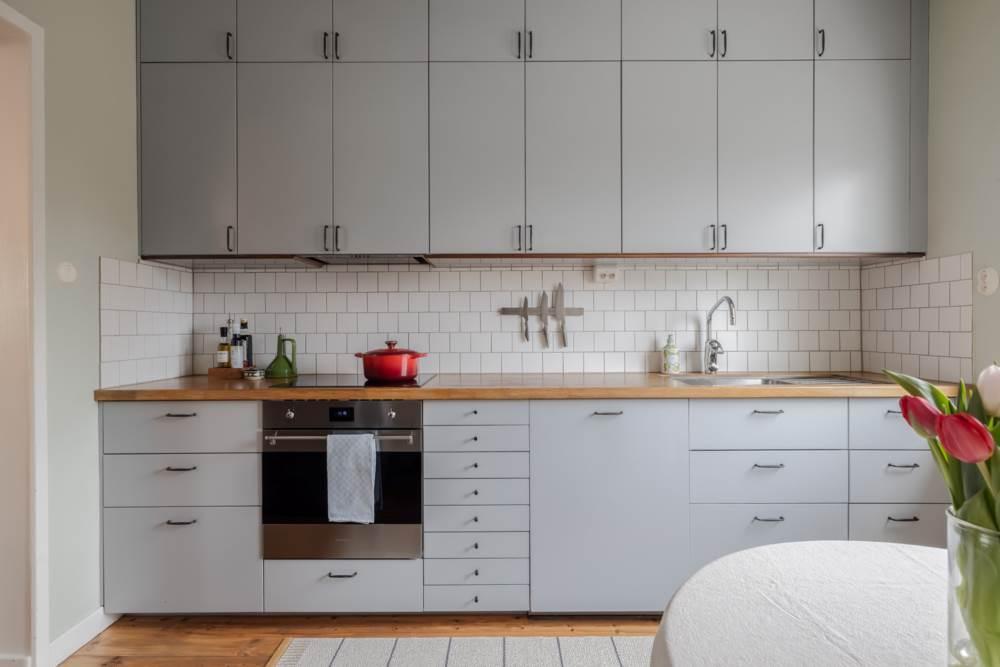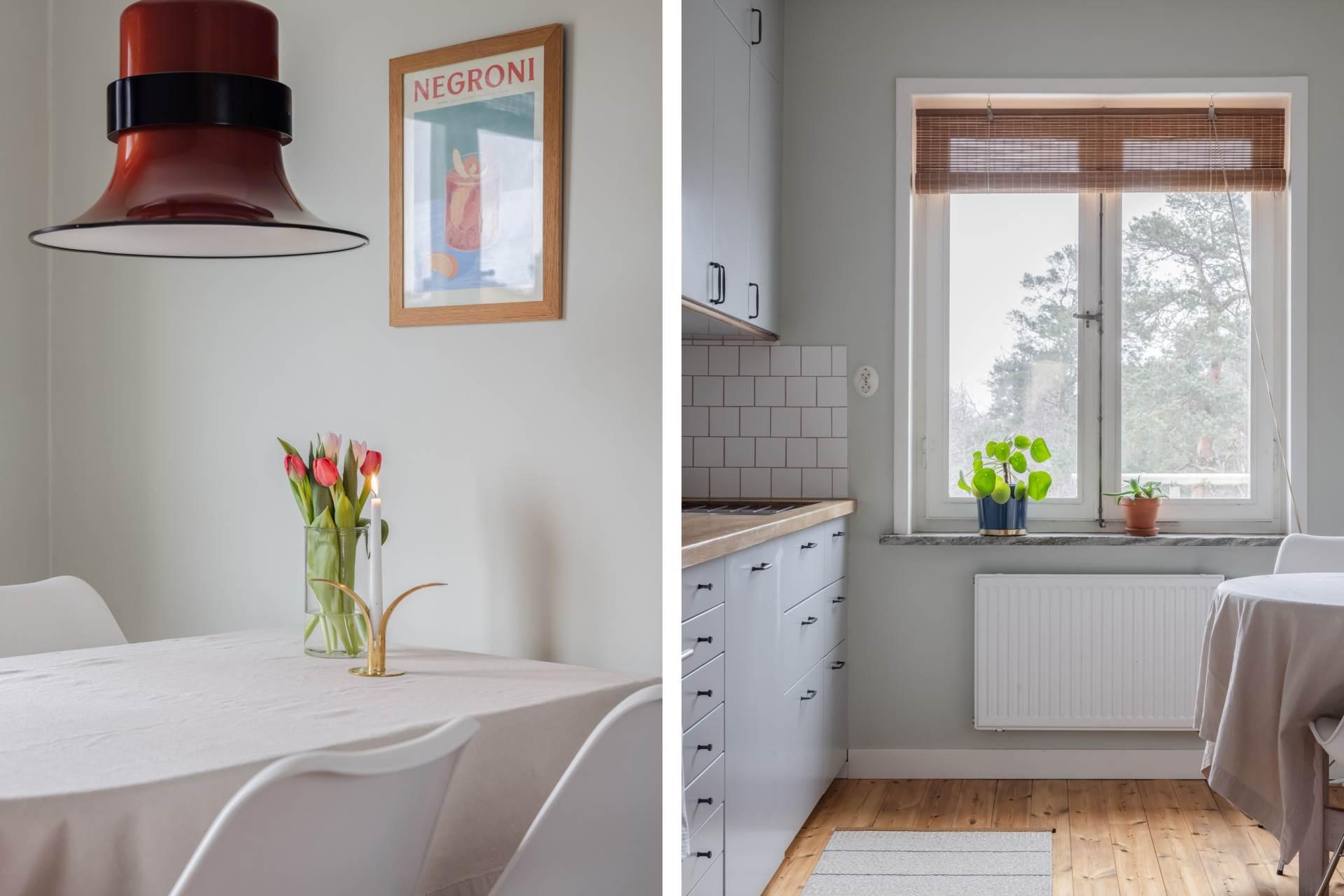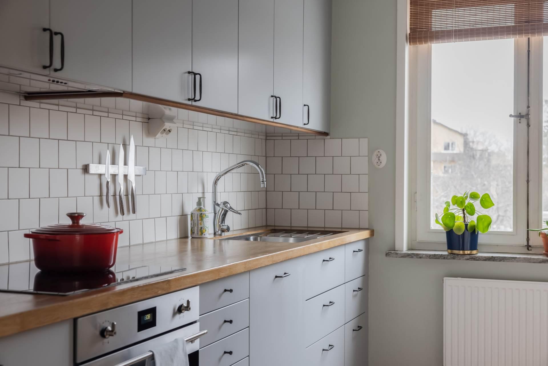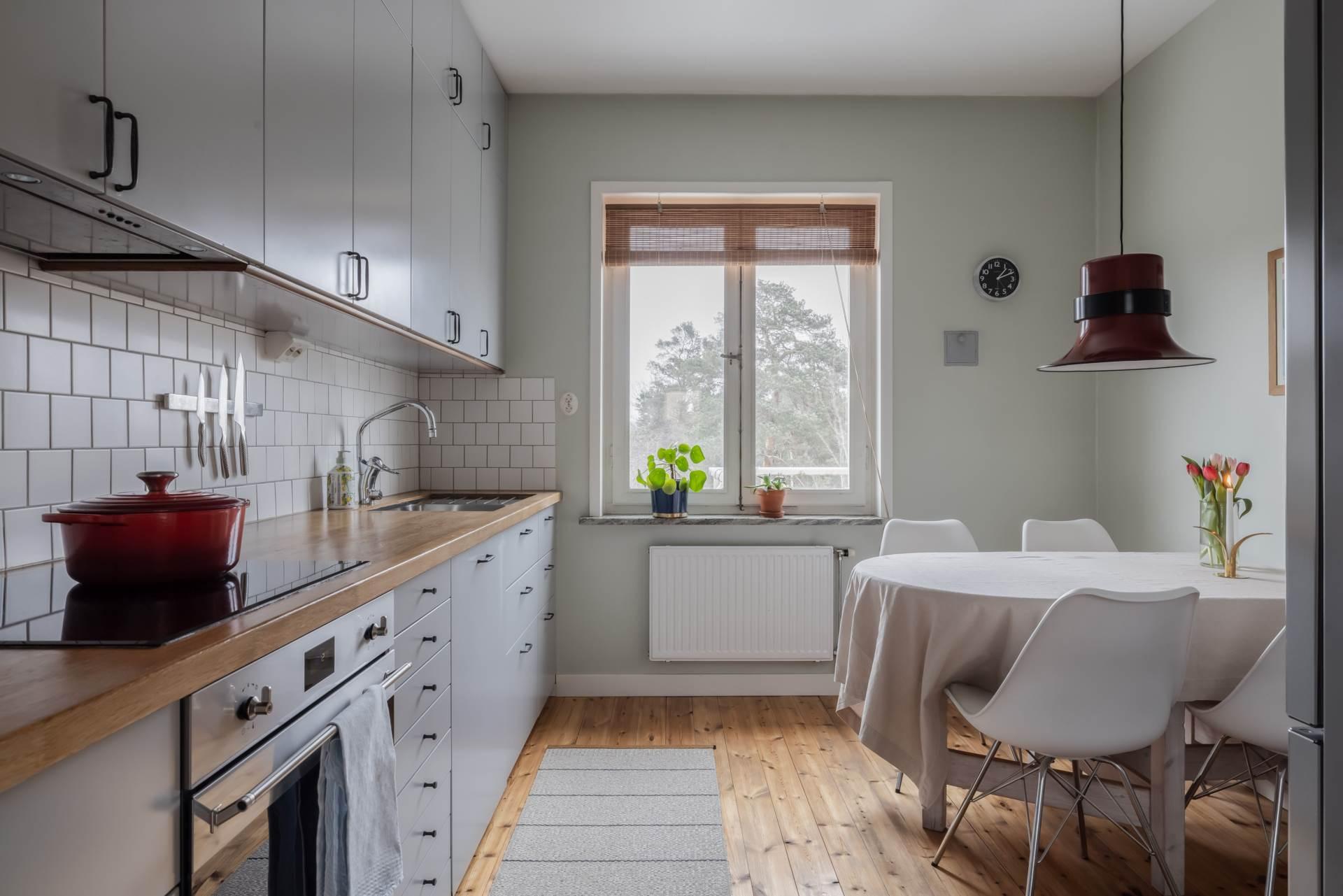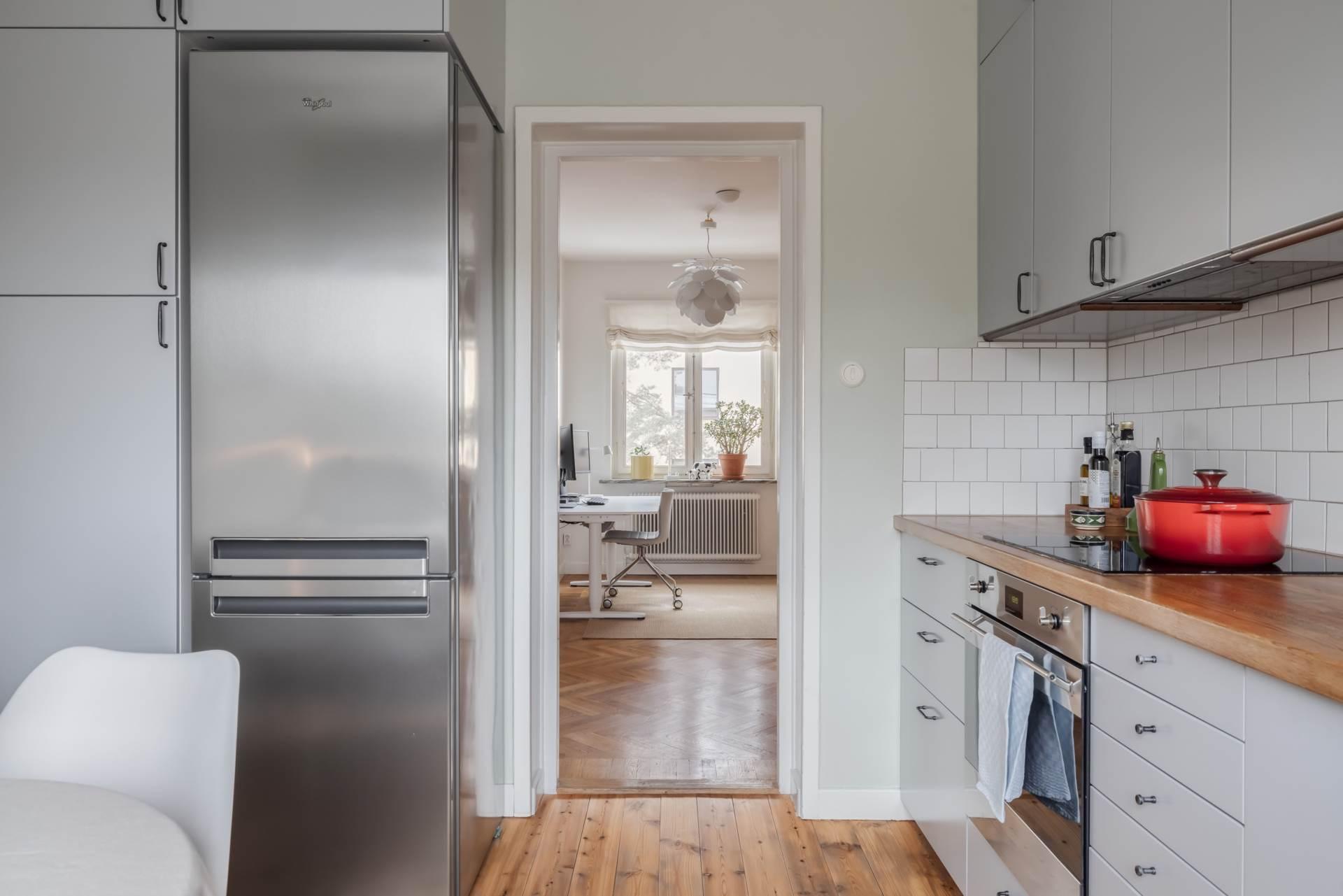 Det stilrena köket bjuder på en vy som sträcker sig hela vägen in mot stadens siluett – en ovanlig och uppskattad detalj som gör vardagen lite mer speciell. Här finns gott om arbetsyta och förvaring, och den insynsskyddade placeringen gör att du kan laga mat i lugn och ro.