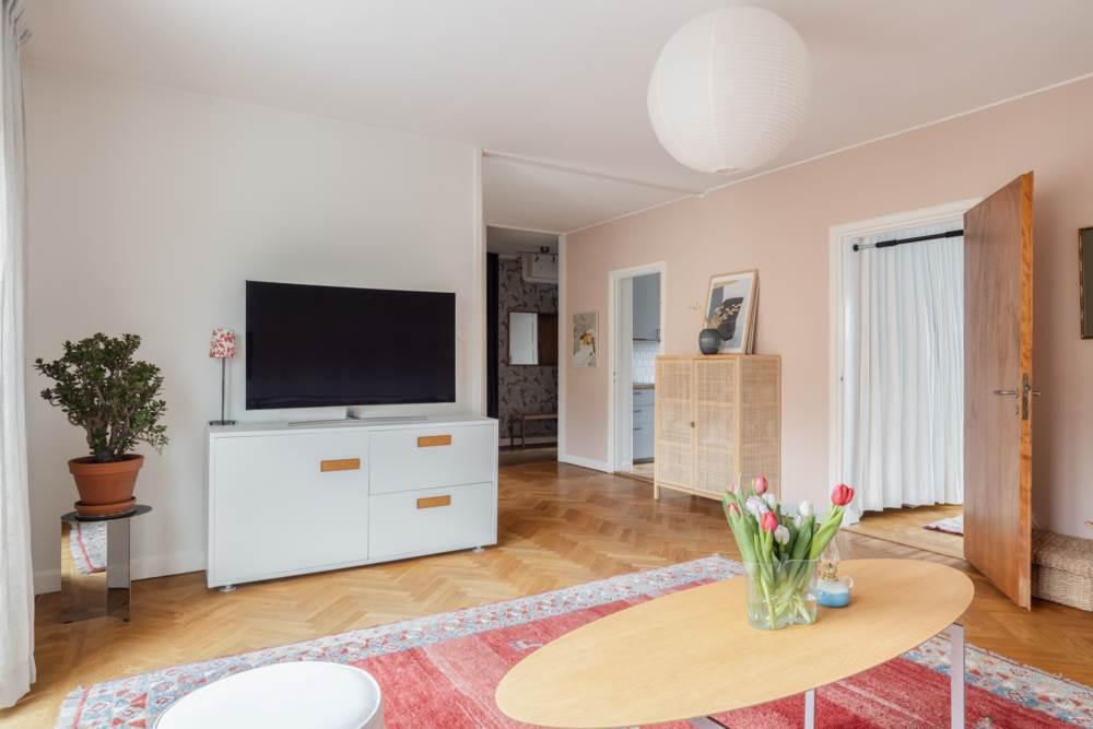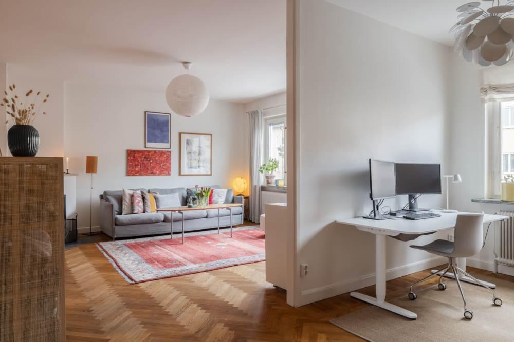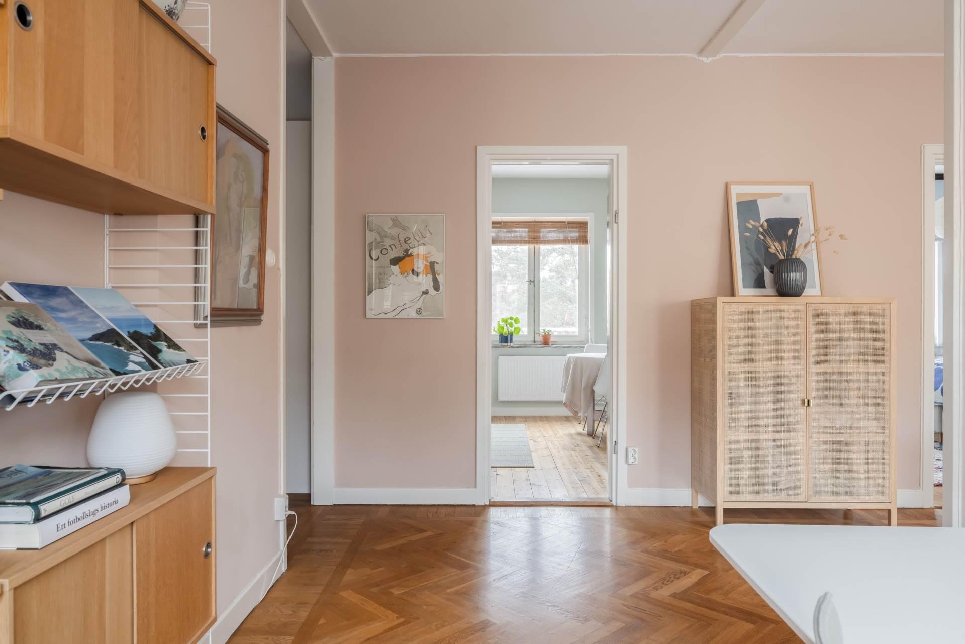 Redan när du kliver in möts du av den karaktäristiska funkiskänslan med generös takhöjd, vackert ljusinsläpp och fiskbensparkett som ger bostaden både elegans och värme. Planlösningen är väl genomtänkt med fönster i två väderstreck, vilket skapar ett fantastiskt ljusflöde och en luftig atmosfär i hela lägenheten.