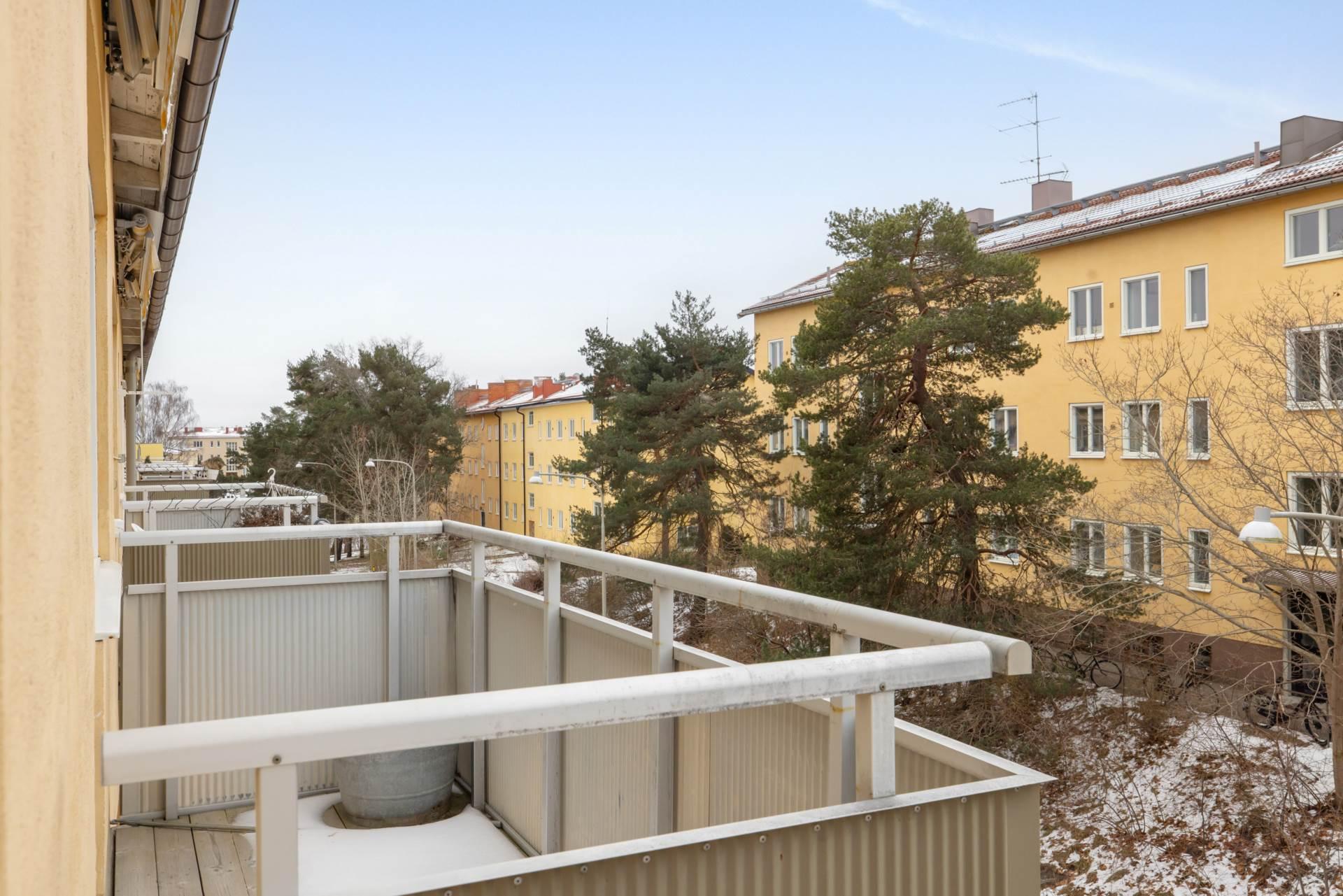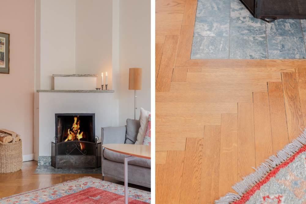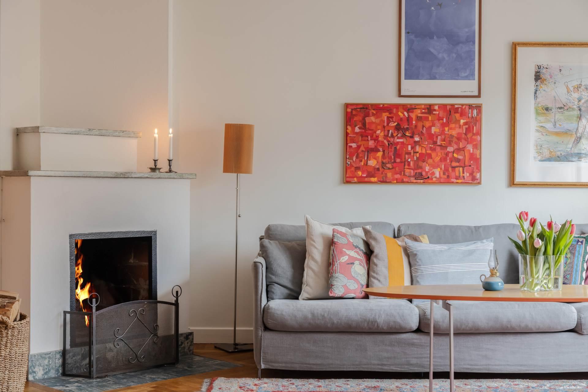 Vardagsrummet är bostadens hjärta – rymligt, inbjudande och med den öppna spisen som naturlig samlingspunkt under årets kallare månader. Härifrån når du även en av bostadens två balkonger. Den andra balkongen ligger i motsatt väderstreck, vilket ger möjlighet att njuta av solen från morgon till kväll – oavsett årstid.