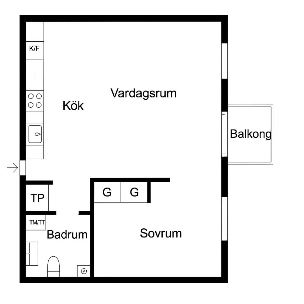 Sovrummet är rofyllt och utrustat med platsbyggda garderober som smart maximerar förvaringen. Det luftiga badrummet är kaklat med mosaikdetaljer och har både tvätt- och torkmöjligheter, vilket gör vardagen smidig och bekväm.