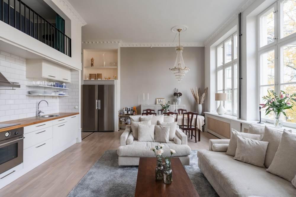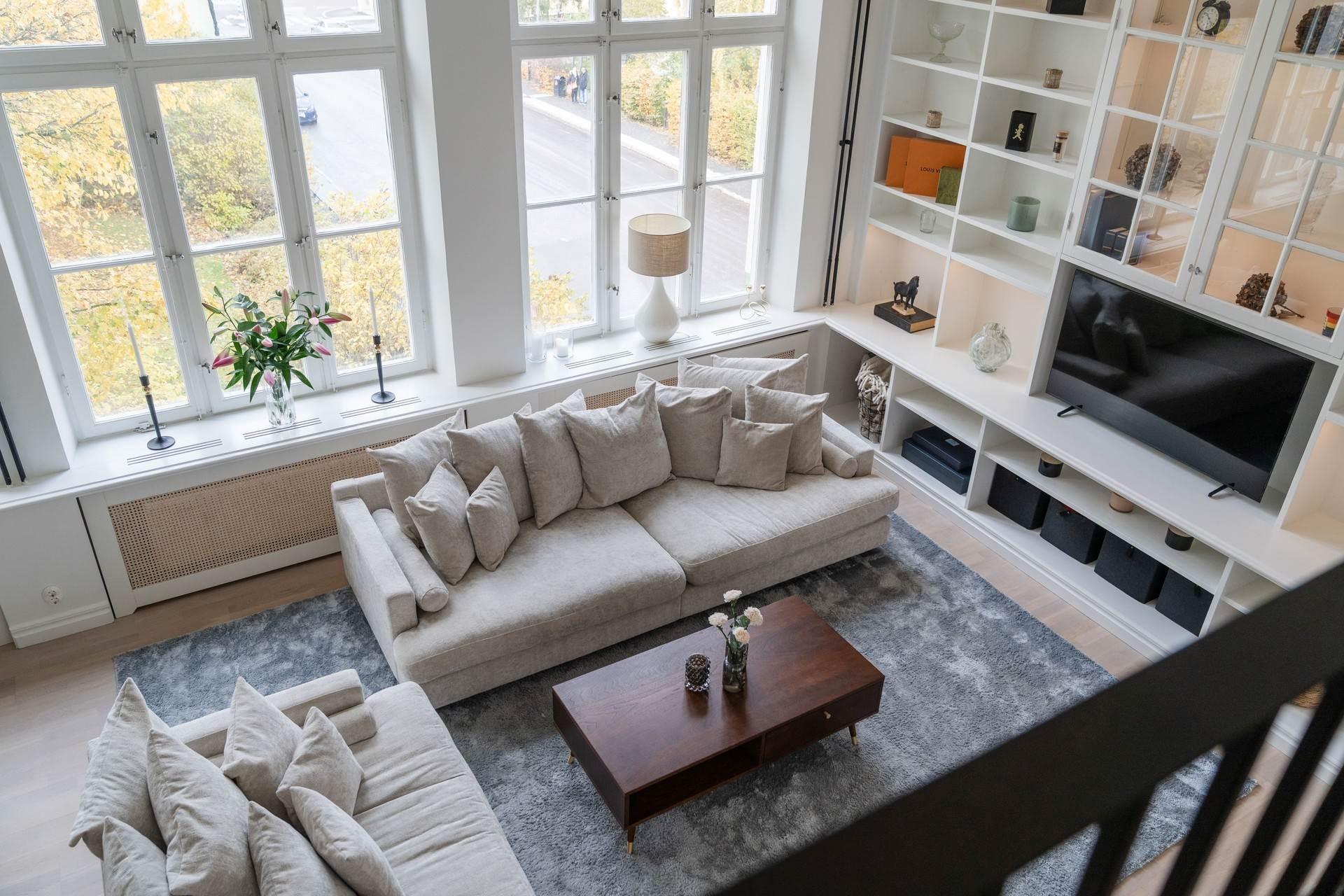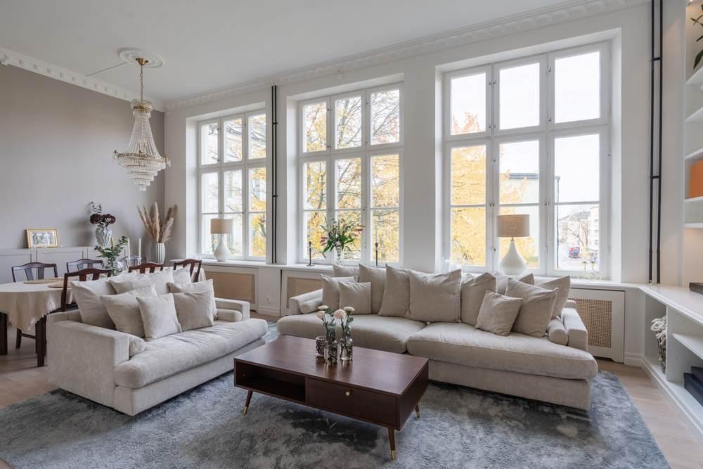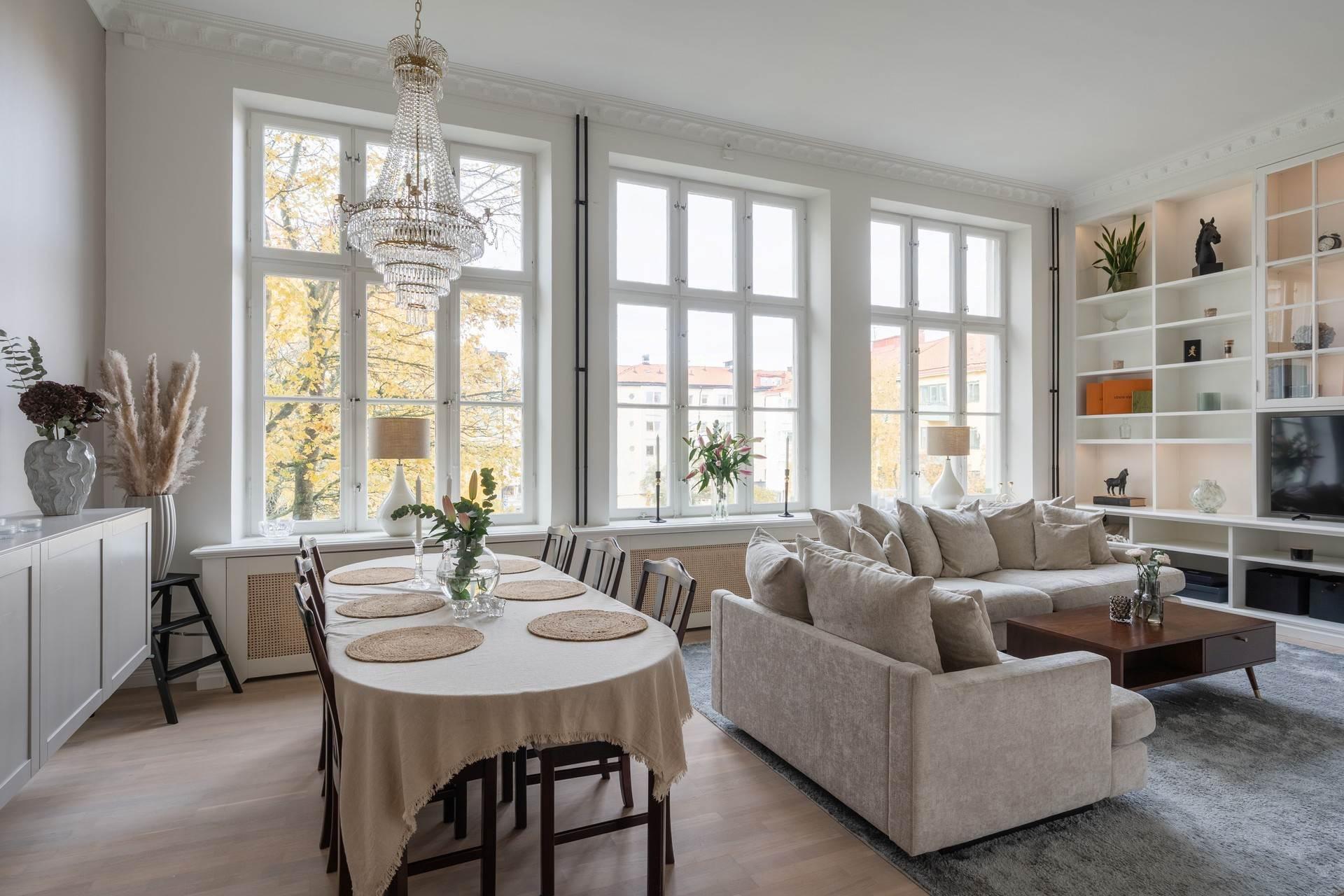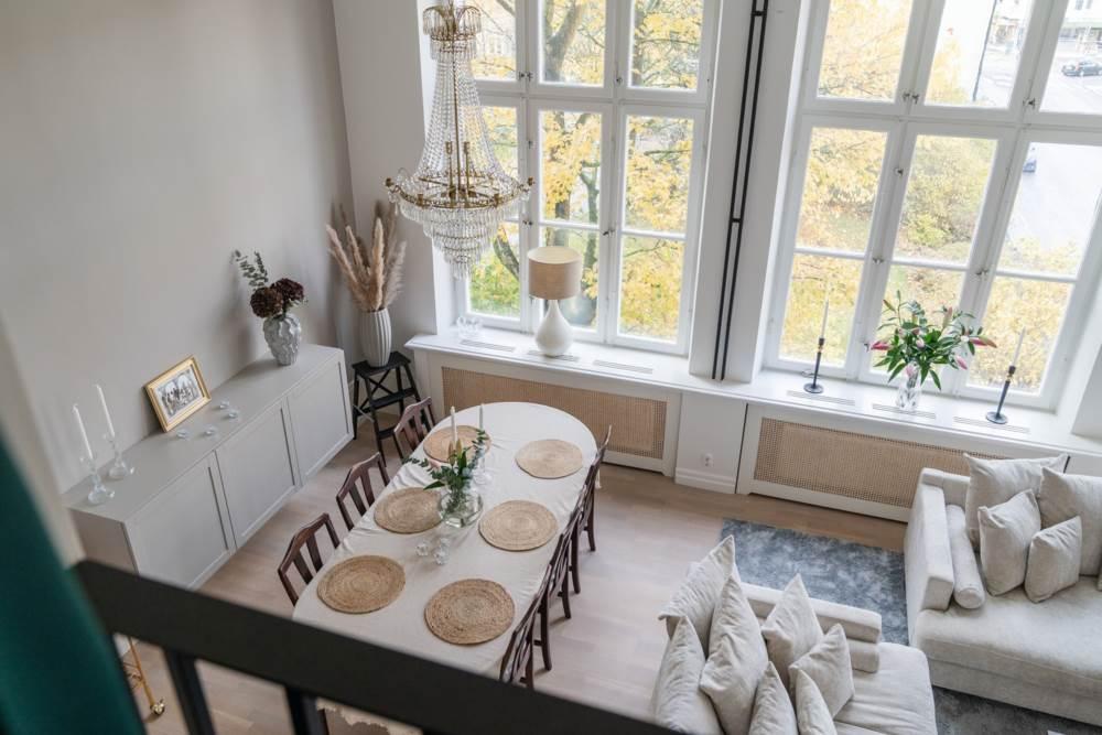 Här bor du med en känsla som är svår att hitta någon annanstans. De enorma spröjsade originalfönstren och den imponerande takhöjden på närmare fyra meter skapar en helt unik rymd och ett ljusflöde som fyller hela hemmet.