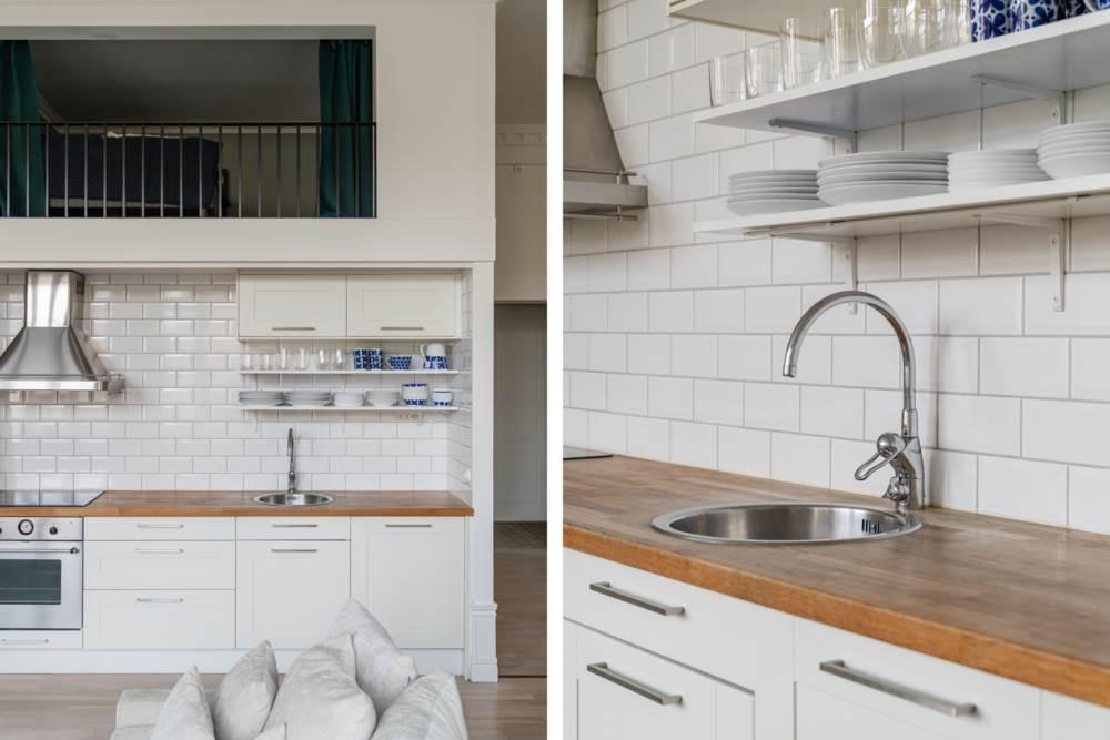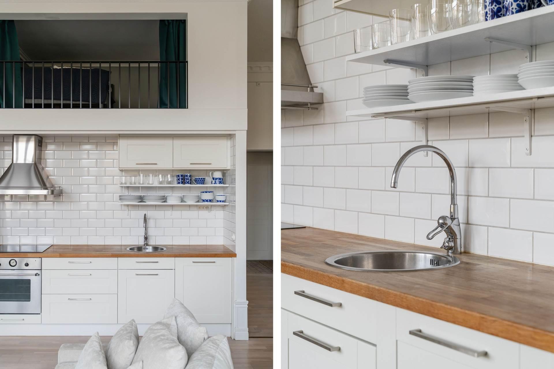 • KökKöket har träbänkskiva, vitt kakel, rostfria vitvaror och öppna hyllor som ger en varm och hemtrevlig känsla.