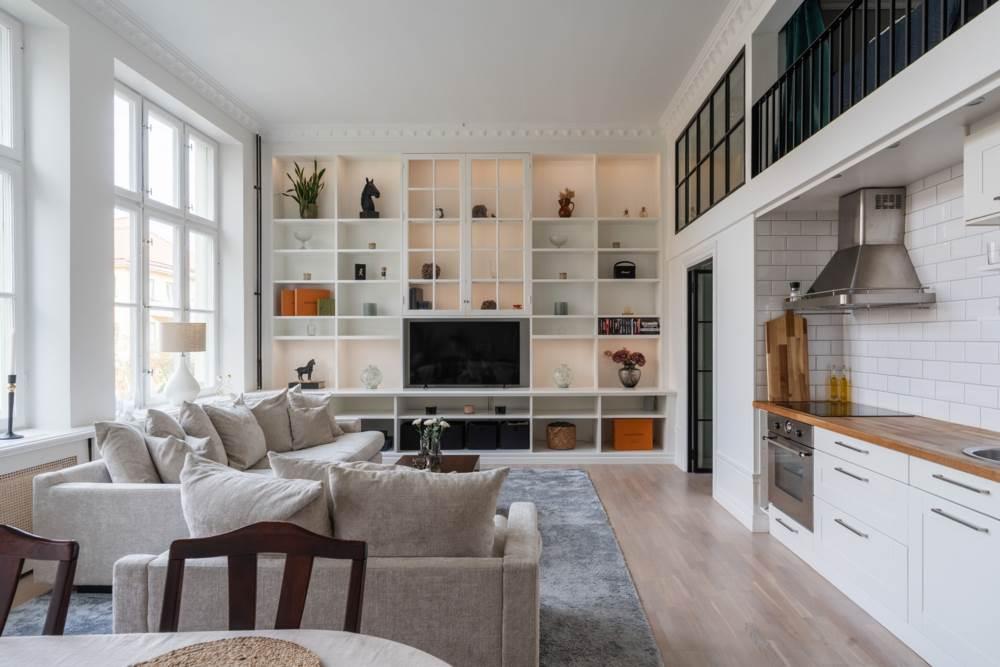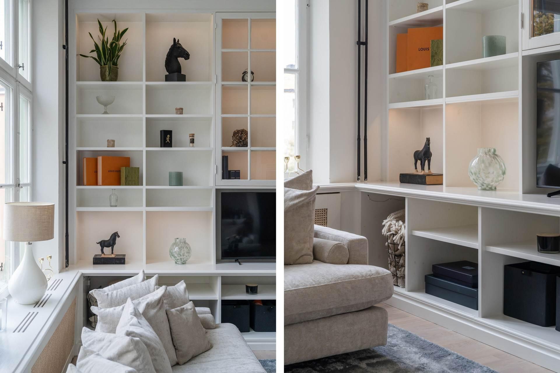 Köket och vardagsrummet är öppet planerat och bildar bostadens naturliga samlingspunkt. Här samsas klassiska material med moderna lösningar, och varje detalj känns väl vald. Den platsbyggda väggen med hyllor ramar in rummet på ett vackert och praktiskt sätt, och de stora fönsterpartierna ger ett ständigt skiftande ljus under dagen.