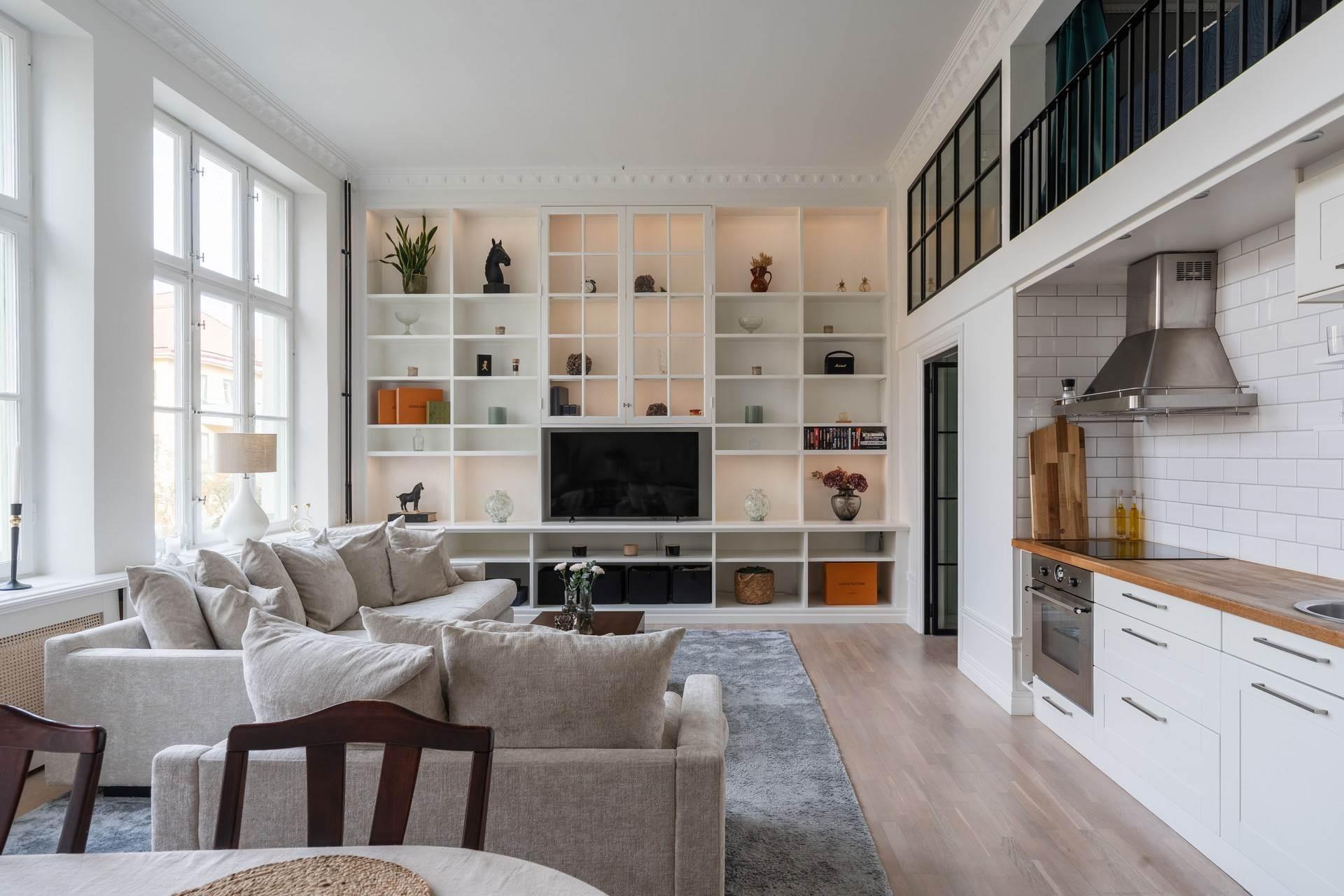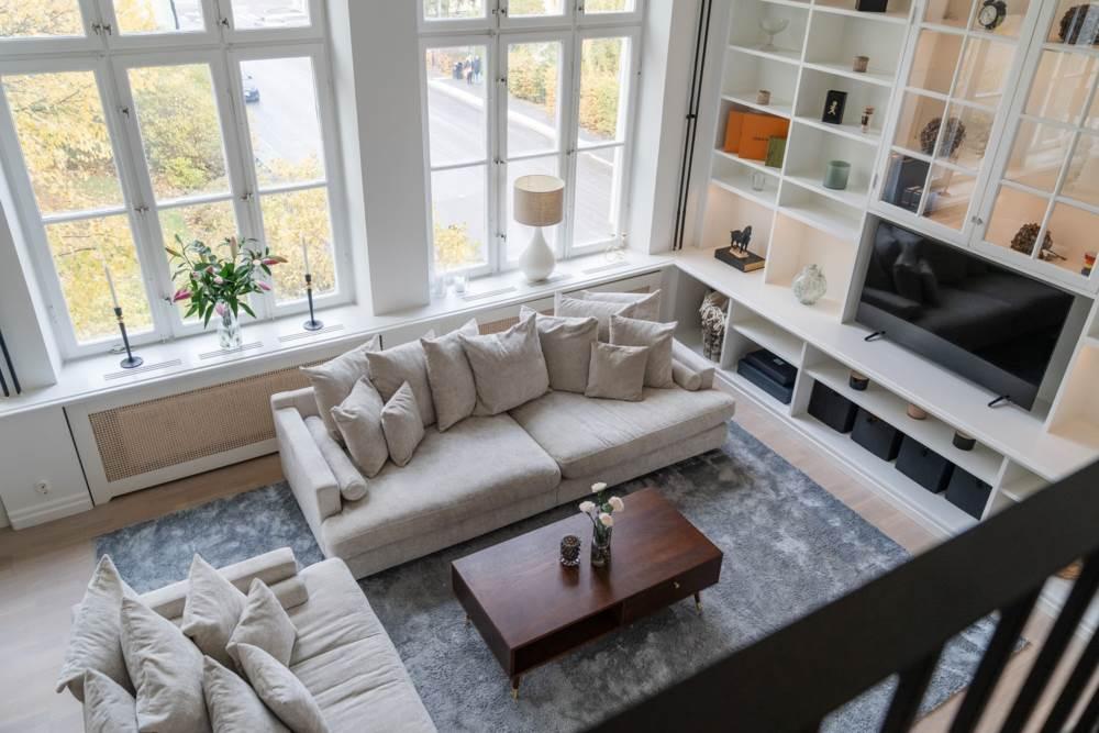 • VardagsrumStort, öppet rum med nästan fyra meters takhöjd och stora spröjsade fönster som släpper in rikligt med ljus. Platsbyggd bokhylla längs väggen som kombinerar förvaring och design.