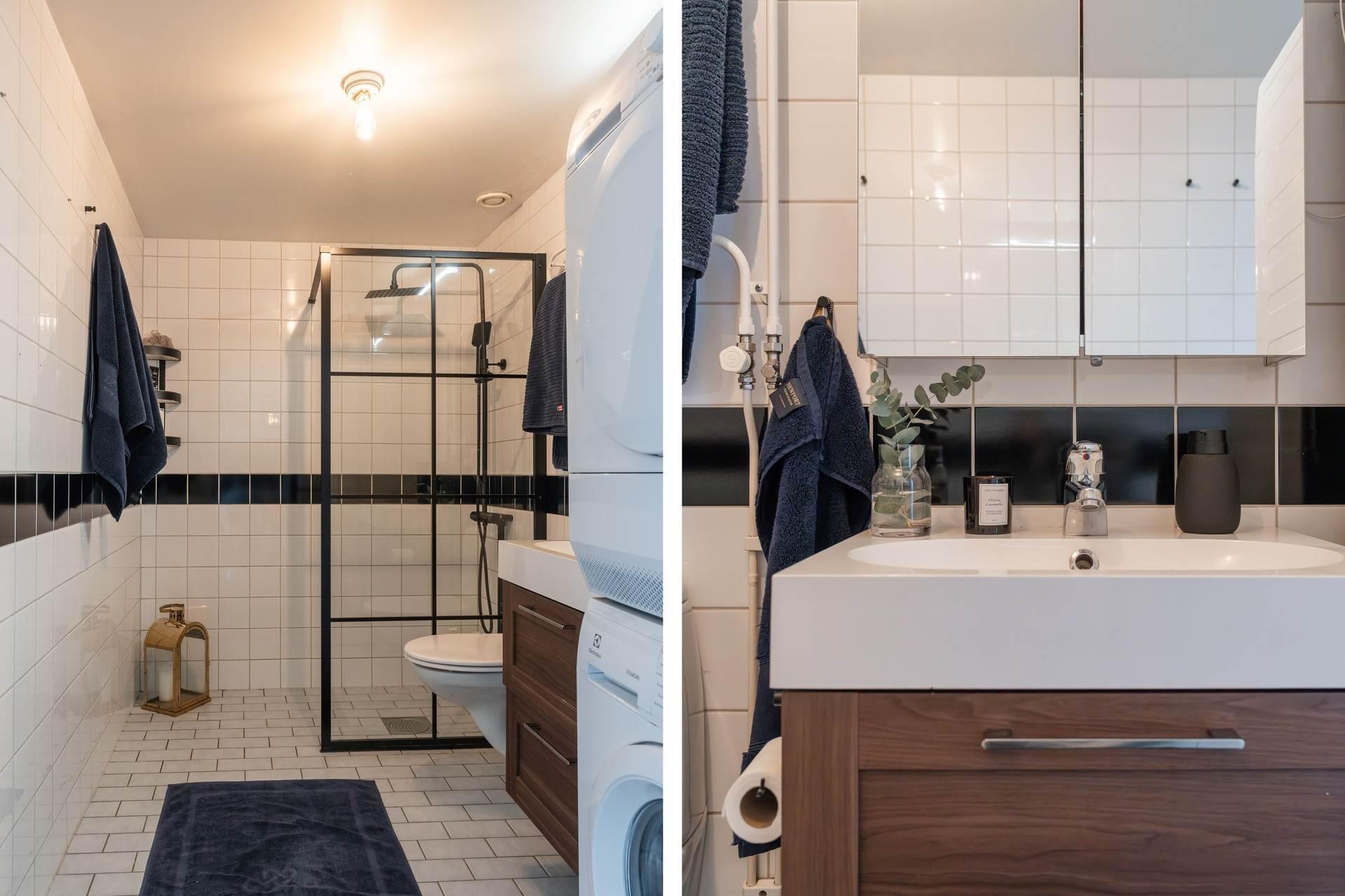 • BadrumHelkaklat badrum i tidlös stil med dusch, glasvägg, tvättmaskin och torktumlare.