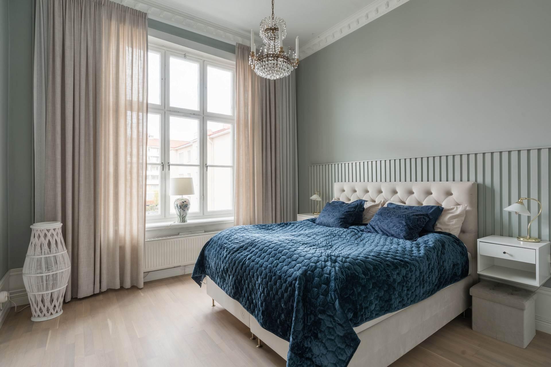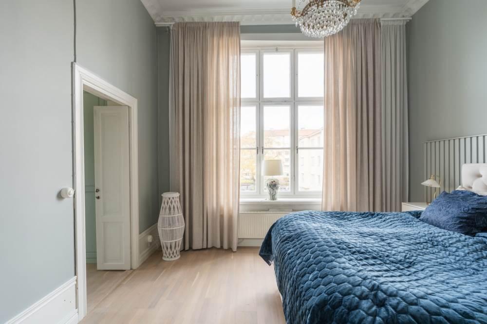 Det separata sovrummet är lugnt och rymligt, med vackra detaljer och gott om plats för dubbelsäng. Här finns också en rymlig walk-in closet med bra förvaring och struktur – både praktiskt och lyxigt i vardagen.